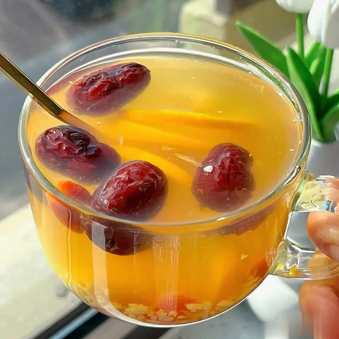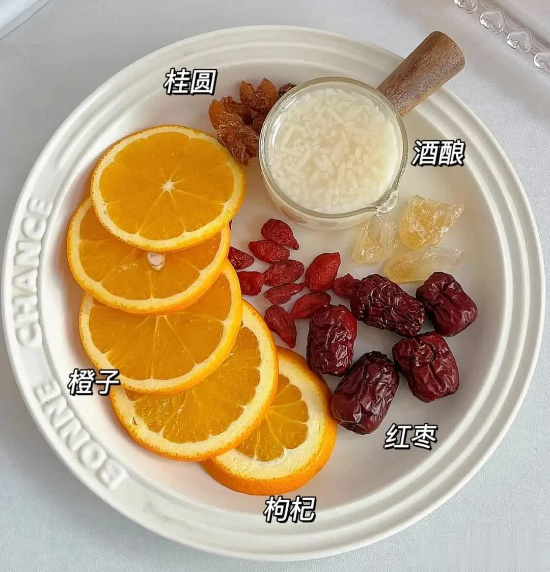 橙子富含维生素 C、类黄酮等营养成分,能增强免疫力、抗氧化,帮咱们抵抗冬日的小病菌,还能滋润肌肤,让脸色越来越好;酒酿可是个养颜好物,能促进血液循环,让气血充盈,所以喝了之后脸色才会红润有光泽;红枣、枸杞、桂圆更是滋补小能手,补气血、暖身体,特别适合咱们女孩子。