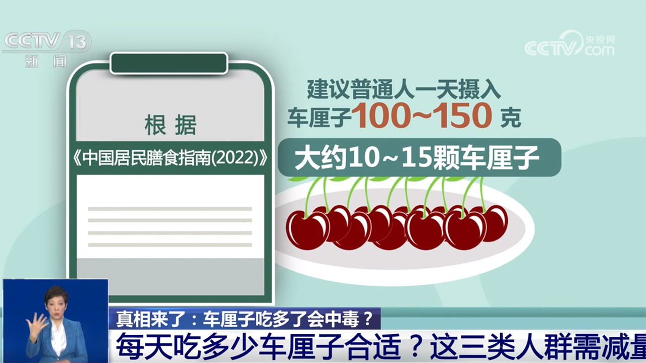 央视网消息:每年这个时候,车厘子大量上市,酸甜多汁的口感引得人不免多吃几颗。不过,有网友发文称“自己‘狂炫’三大碗车厘子后中毒了”,这样的说法也引发热议,有网友留言说自己也有同感,因吃了大量车厘子出现恶心、胃痛、拉肚子的症状;还有网友说,车厘子吃多了会导致铁中毒和氰化物中毒。那么这些都是真的吗?一次进食多少颗车厘子合适呢?